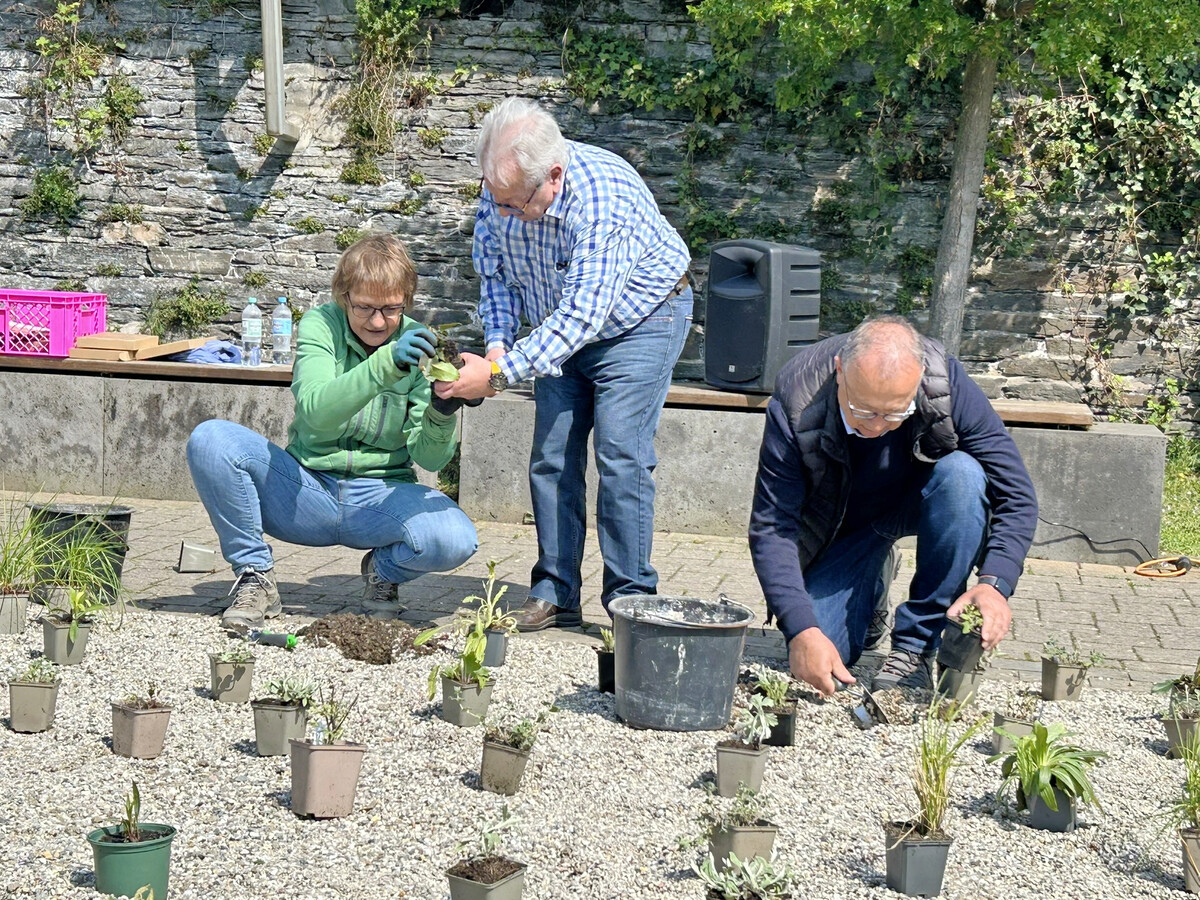 1Der Workshop in Kaub, bei dem auch Bernd Vogt, Bürgermeister der Stadt Kaub, und Rick Vogel, Leiter Planung und Bau der BUGA gGmbH, dabei waren, verband Theorie und Praxis. Im theoretischen Teil gab Landschaftsarchitektin Bettina Jaugstetter Hinweise zur Bodenvorbereitung, Pflanzung und Pflege. Im Praxisteil wurden die Inhalte direkt auf der Fläche umgesetzt. Im Fokus standen Pflanzstandard und Startpflege. An der Pflanzung beteiligten sich neben den Fachverantwortlichen auch Bürgermeister Bernd Vogt und Buga-Geschäftsführer Sven Stimac.