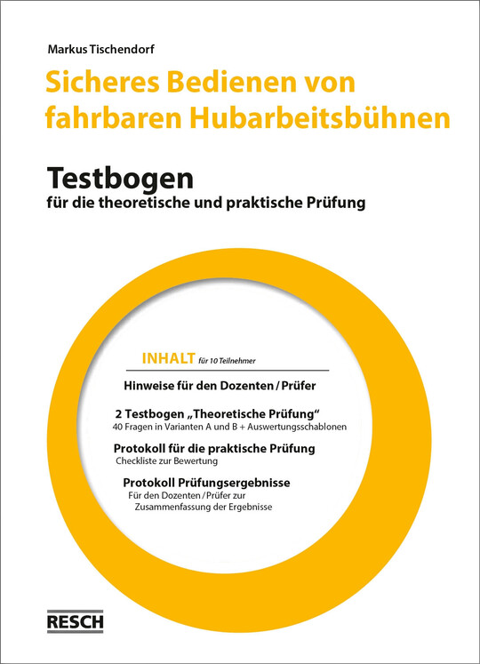Ergänzend dazu erarbeitete Markus Tischendorf ein Testbogenpaket für Dozenten und Trainer, die schnell, fachkundig und rechtssicher eine Lernerfolgskontrolle durchführen und dokumentieren wollen. Für die theoretische Prüfung stehen zwei Testbogen-Varianten mit jeweils 40 Fragen im Multiple-Choice-Verfahren zur Auswahl, deren Ergebnis schnell und sicher mit den Auswertungsschablonen ermittelt werden kann. Außerdem ist eine Anleitung zur praktischen Prüfung mit Checkliste sowie eine abschließende Dokumentationsvorlage für die Ergebnisse enthalten. Die Inhalte des Prüfungspakets sind auf das Resch-Lehrsystem „Sicheres Bedienen von fahrbaren Hubarbeitsbühnen“ abgestimmt. Das Paket „Testbogen für die Prüfung von Bedienern von fahrbaren Hubarbeitsbühnen“ für zehn Teilnehmer ist zum Preis von 89 € beim Resch-Verlag lieferbar.