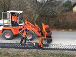 Die Bauunternehmung Stammberger GmbH aus Rödental im Landkreis Coburg hatte einen 500 m langen Randstreifen entlang einer Straße in Lautertal ausgekoffert und bereits mit einer Frostschutz-Mineralmischung 0/45 verfüllt und verdichtet. Dann brachte man mit Hilfe der Material-Verteilschaufel „Finliner“ von Optimas eine Mineralbetonmischung 0/20 ein. Die „Finliner“ ist eine hydraulisch betriebene Material-Verteilschaufel von 2,60 m Breite. Die Länge des Förderbandes beträgt 2,50 m. Trägergerät ist ein Radlader. Sie passt an jedes Fabrikat. Der Anbau per Schnellwechsler geht sehr flott. Ist die „Finliner“ montiert, kann sie um 90° nach vorn geschwenkt werden, um Material aufzunehmen, oder per zweitem Radlader bzw. LKW beladen werden. Durch ein an der „Finliner“ montiertes Stahlschild konnte das Einbaumaterial im selben Arbeitsgang auf die gewünschte Höhe gebracht werden. Da die Material-Verteilschaufel „Finliner“ das Material durch ein Fließband seitlich auswirft, kann der Radlader immer geradeaus fahren. Er wird direkt vom Lkw mit frischem Material beschickt. So konnte extrem schnell gearbeitet werden. Alle Fahrten des Radladers, die mit Materialaufnahme oder dem früher immer wieder erforderlichen Heranfahren an die Baustelle nötig waren, entfallen durch die „Finliner“.