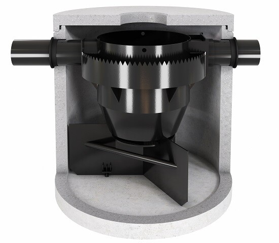 Die Anlage besteht aus zwei Komponenten: Dem bewährten HydroSystem, das seit mehr als 20 Jahren erfolgreich in der dezentralen Abwasserbehandlung von Verkehrsflächen eingesetzt wird, sowie dem neu entwickelten HydroShark. In der ersten Stufe passiert das Wasser den HydroShark. Es wird tangential in der Mitte des Systems eingeleitet. Durch den „Teetasseneffekt“ sedimentieren Feststoffe in der Mitte der Rotationsbewegung und sinken in einen Schlammfang ab. Er ist durch einen Gitterrost und Strömungsbrecher hydraulisch vom Behandlungsraum getrennt, so dass es auch bei Starkregen nicht zu einer Rücklösung der abgesetzten Partikel kommen kann. In einem Außenring wird das Wasser anschließend gleichmäßig nach oben geführt. Das namensgebende Zackenwehr des HydroShark sorgt für eine möglichst homogene Strömung ohne Kurzschlussströmungen. Leichtstoffe wie Öle oder Pollen können nicht unter der Abscheidewand durchtauchen und werden daher effektiv zurückgehalten. Die Reinigungsleistung entspricht den Vorgaben aus den Merkblättern M-153 und A-102 der Deutschen Vereinigung für Wasserwirtschaft, Abwasser und Abfall e.V. (DWA).