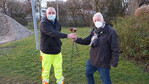 Einen Strauß der besonderen Art übergibt Michael Meiser, Geschäftsführer der mm-lab GmbH, an Christian Lang, den stellvertretenden Leiter der Stadtgärtnerei Kornwestheim: drei weitere Bodenfeuchtesensoren werden künftig messen, wieviel Wasser einem neu gepflanzten Ginkgo-Baum in verschiedenen Tiefen zur Verfügung steht. Junge Bäume, deren Wurzel noch nicht voll ausgeprägt ist, sind besonders anfällig für Trockenstress. Die rechtzeitige Vorhersage von gefährlicher Trockenheit im Bereich der Wurzel soll der Stadtgärtnerei dabei helfen, zielgerichtet und mit der optimalen Wassermenge zu gießen. Arthur Teuber ist Projektleiter des mm-lab Projektes „Smarte mobile Bewässerung von Stadtbäumen“, das im Rahmen der Mittelstandsförderung vom Bundeswirtschaftsministerium unterstützt wird. Er aktiviert die Übertragung der Sensordaten im LoRaWAN-Netzwerk der Stadtwerke Ludwigsburg-Kornwestheim. Diese unterstützen das Projekt mit eigenen Sensoren und ihrer Kommunikationsinfrastruktur.