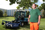 So zum Beispiel im Luthergarten: Hier verändern sich die Anforderungen an Fahrer und Maschine. In engen Radien umfährt Ziepel routiniert Bäume und Blumenbeete. Vor- und Zurücksetzen muss er selten, die dynamische Knicklenkung passt sich der Topografie mit ihren augenschmeichelnden Beetanlagen problemlos an.