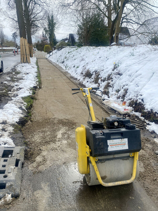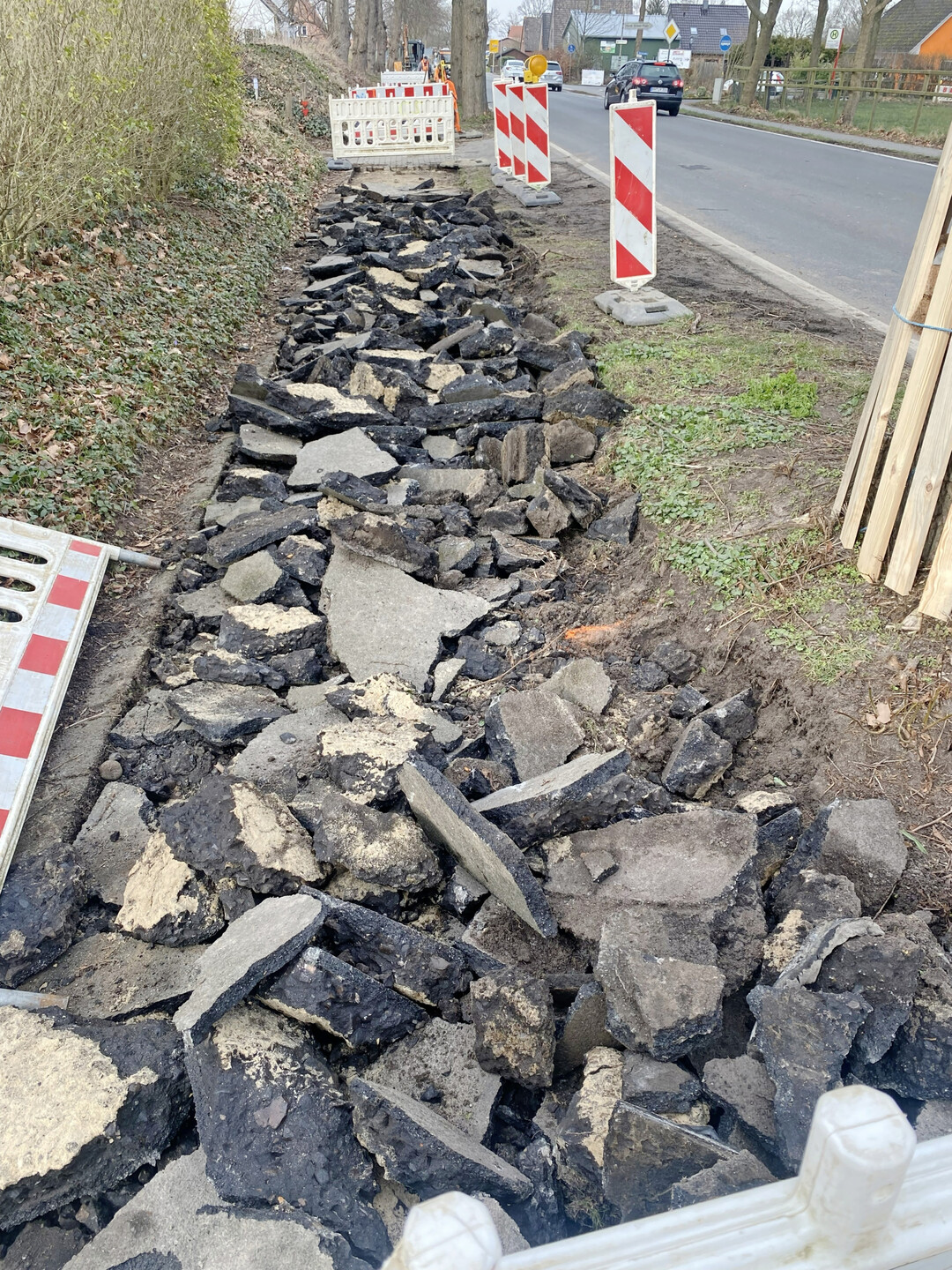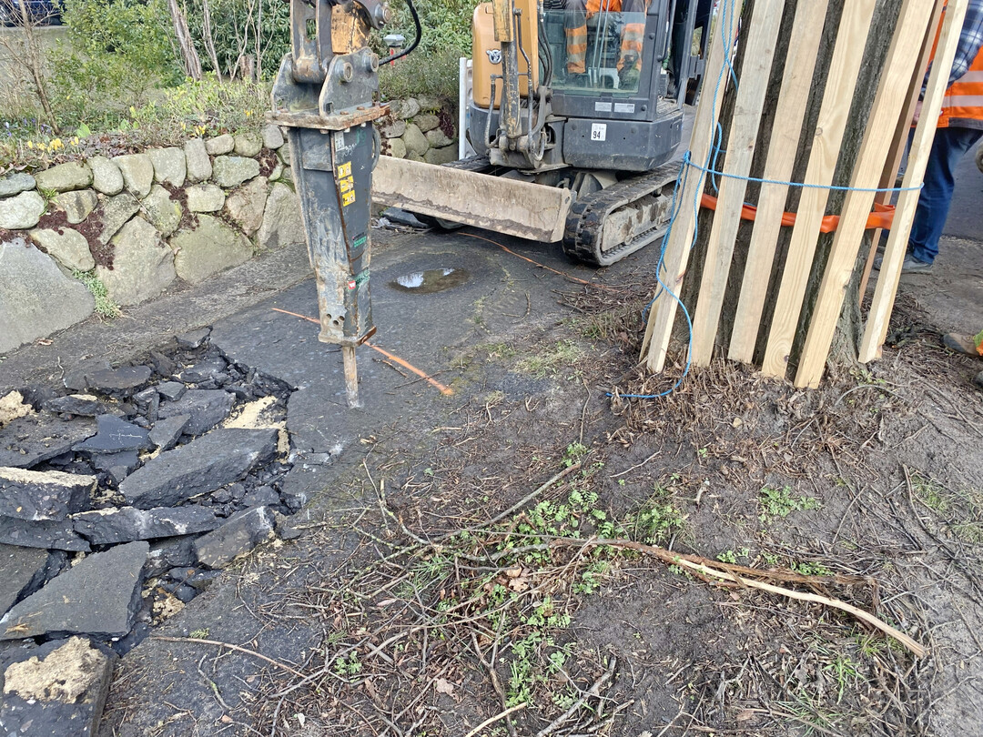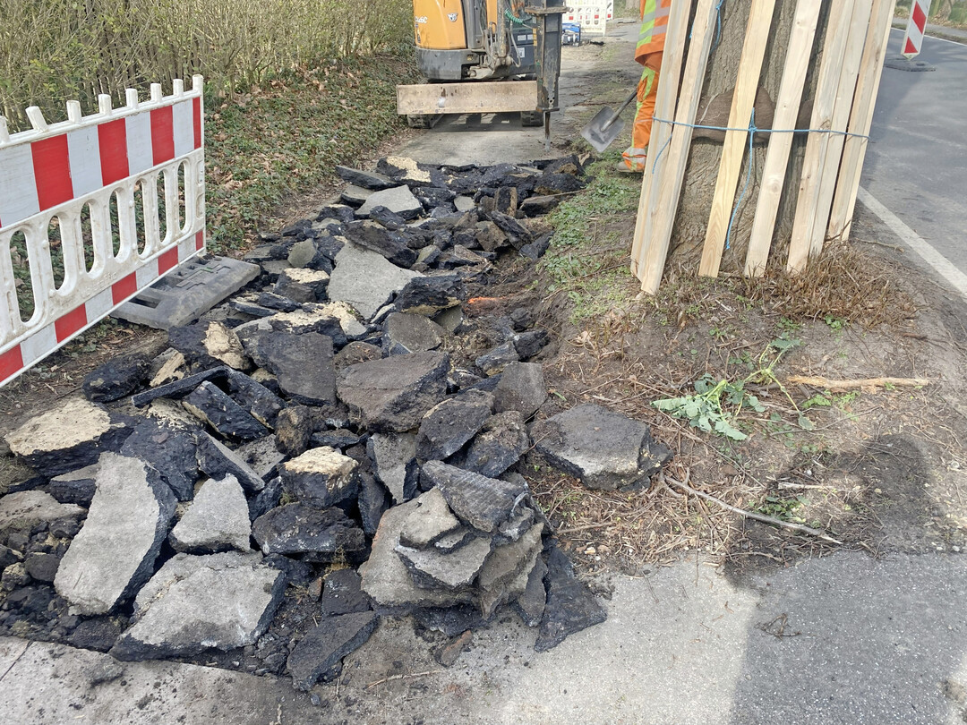 Jeder Baum bekam selbstverständlich vor dem Einsatz den obligatorischen 2,0 m hohen Stammschutz. Die Asphaltdeckschicht wurde daher mithilfe eines Minibaggers aufgebrochen und die Schollen anschließend per Hand aufgenommen. Das Risiko, beim Fräsen, Schneiden oder maschinellen Beräumen Wurzeln zu beschädigen, war zu hoch, sodass man sich für dieses Verfahren entschied. Dies hatte zur Folge, dass der Weg über die gesamte Breite und nicht – wie üblich – lediglich in Tieflöffelbreite zurückgebaut werden musste.