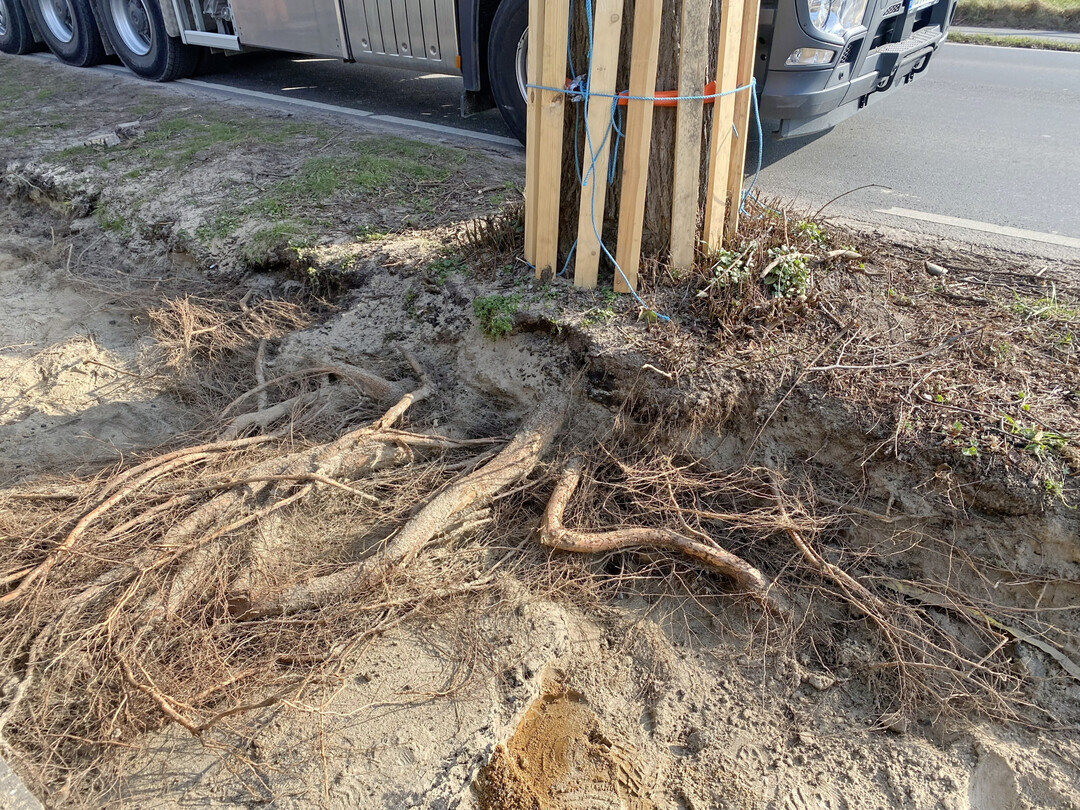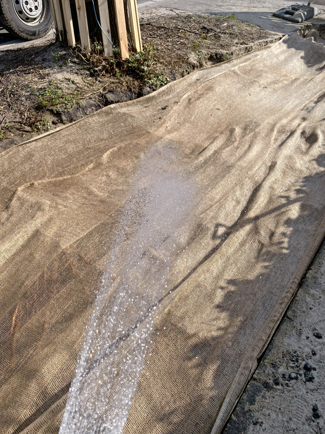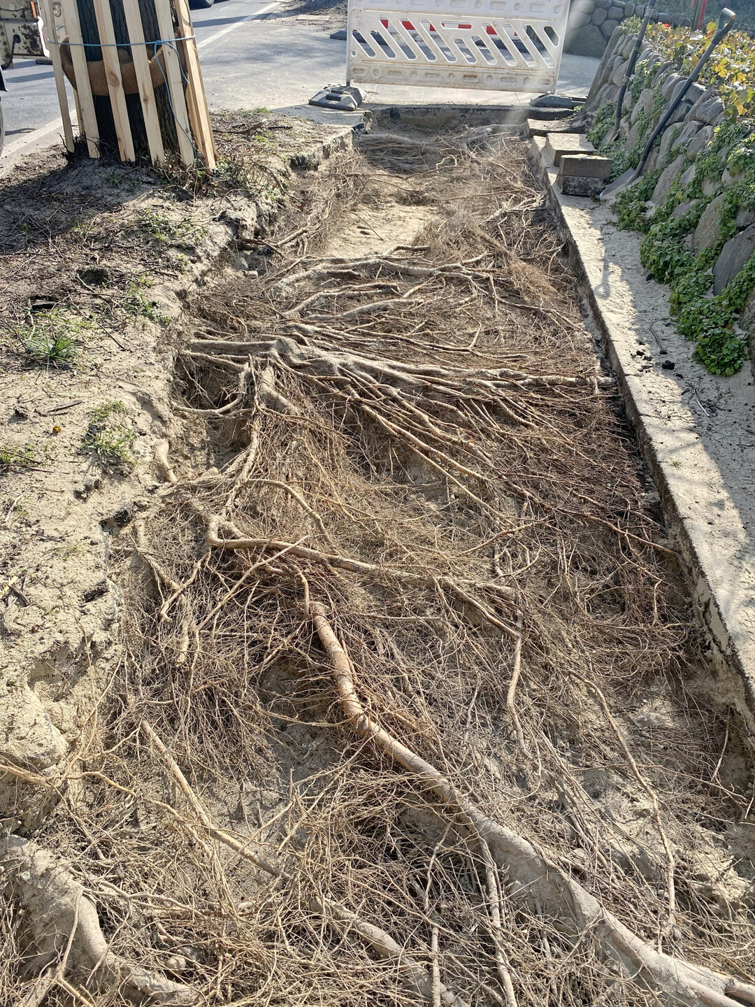 1Die Tragschicht, in diesem Fall reiner Sand, wurde ebenfalls auf ganzer Breite mithilfe eines Lkw-Saugbaggers abgesaugt. Bereits nach wenigen Zentimetern zeigte sich ein dicht verzweigtes Wurzelnetz mit unterschiedlichen Durchmessern – von 1 bis 30 cm war alles vertreten. Die freigelegten Wurzeln wurden sogleich mit Jute und Vlies abgedeckt und intensiv bewässert. Erfreulicherweise stellten die Anwohner nach einer kurzen Projektvorstellung ihr Wasser kostenlos zur Verfügung – es geschehen also doch noch Wunder. Wichtig dabei: