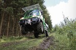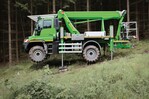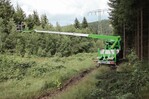 Die Antwort bietet Palfinger mit seiner softwaregesteuerten elektrohydraulischen Bühne P 250 BK der Light NX-Klasse. Arbeitskorb und Armsystem sind aus leichtem Aluminium gefertigt. Die Stützen können sowohl vom Boden als auch vom Arbeitskorb aus bedient werden. Durch die senkrechte Abstützung in Fahrzeugbreite (2,32 m) sind Einsätze auf engen, schwer zugänglichen Waldwegen innerhalb kürzester Rüstzeit möglich. Der enorme Stützenhub von 1.300 mm ermöglicht Arbeiten in schwierigen Hanglagen.