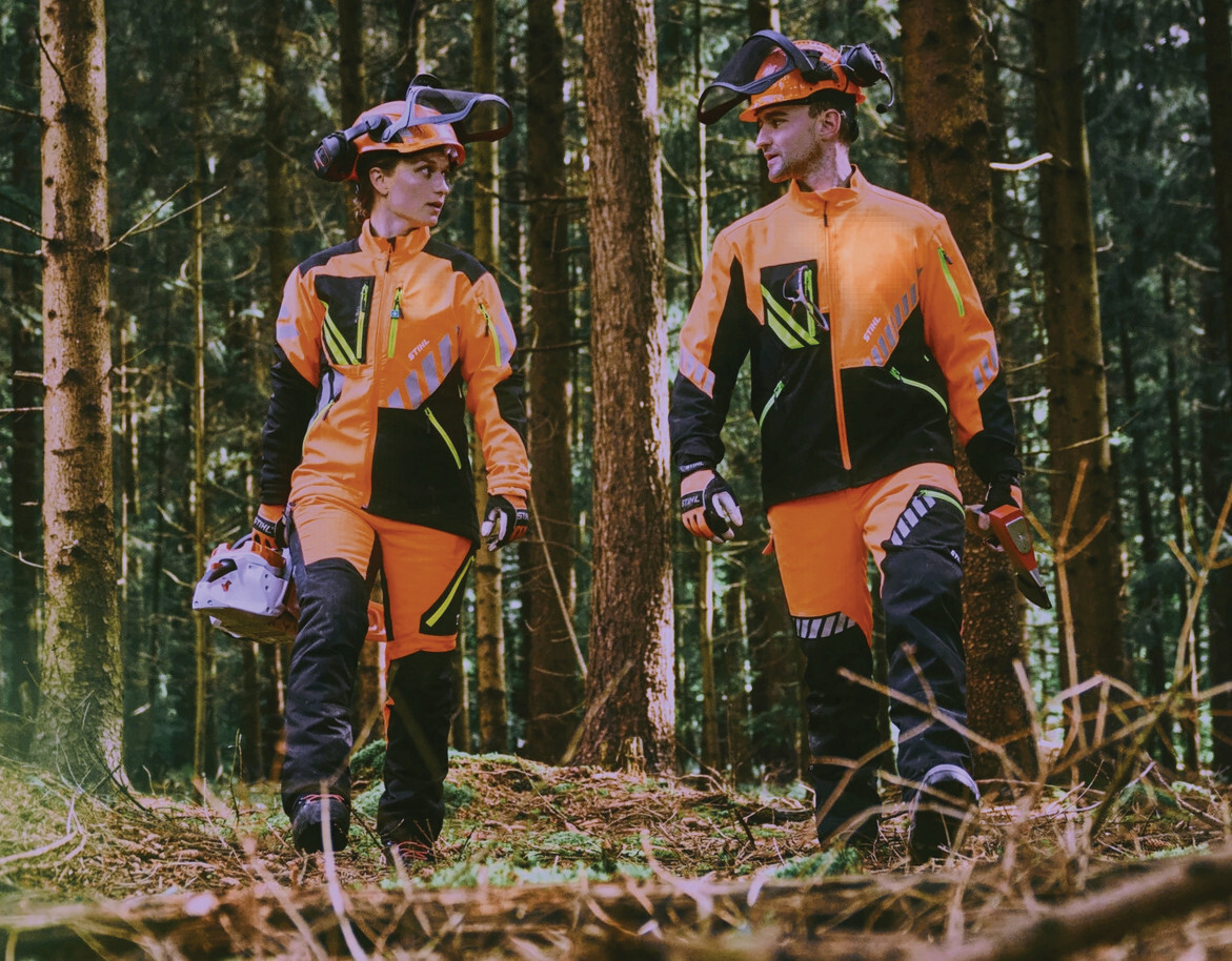 Beim Umgang mit der Motorsäge muss auch die persönliche Schutzausrüstung höchsten Ansprüchen genügen. Sie soll auch unter harten Bedingungen zuverlässig und angenehm zu tragen sein – in dieser Beziehung ist bei Stihl Jacke wie Hose.