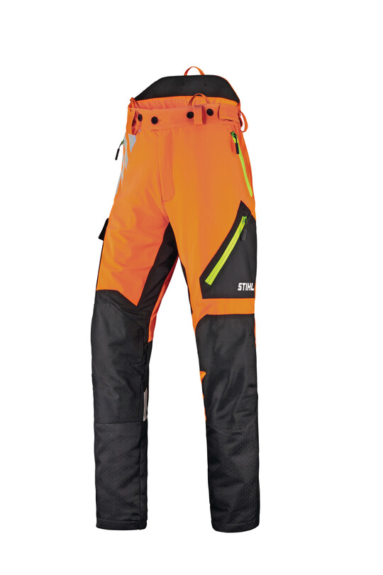 Bei höheren Temperaturen oder wenn man beim Arbeiten ins Schwitzen gerät, lassen sich sowohl bei den Hosen als auch bei der Waldarbeitsjacke Belüftungsöffnungen an den Oberschenkeln und unter den Achseln per Reißverschluss öffnen. Für gute Sichtbarkeit auch in unübersichtlichem Gelände oder bei ungünstigeren Lichtverhältnissen sorgen Reflexstreifen und ein hoher Warnorange-Farbanteil.