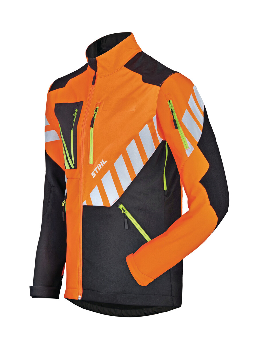 Bei der vollelastischen Waldarbeitsjacke STIHL Advance ShellTEC bestehen der Oberstoff in Orange und der Abriebschutz an den Ellenbogen aus wasserdichtem Material, der schwarze Shell ist ohne Membrane und daher sehr atmungsaktiv; bei niedrigeren Temperaturen schützt das angenehm weiche Fleecematerial der Innenseite.