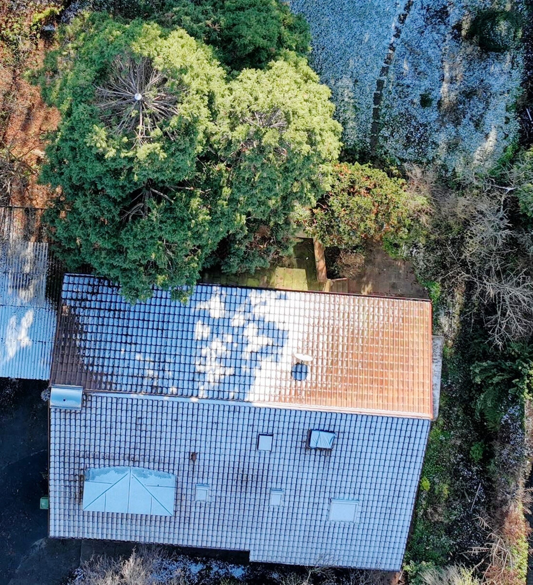 Diverse Fachkräfte und Laien hatten sich augenscheinlich bereits an der Sicherung mittels Spanngurten und Verbolzung versucht. Das Gespräch mit den heutigen Eigentümern führte zu der Erkenntnis, dass vor über zehn Jahren ein Blitzschlag die Terminale ausbrechen ließ und eine Ausnahmegenehmigung für die Befreiung von den Verboten der Baumschutzsatzung (also eine Fällgenehmigung) vorlag. Die damaligen Eigentümer entschieden sich mit fortlaufendem, finanziellem Aufwand für einen Erhalt des Baumes. Heute überragt der Baum das Gebäude, bietet Lebensraum und ist pflegeintensiv – aber vorhanden. Die Breite seiner Krone überragt mehr als die Hälfte des Wohngebäudes.