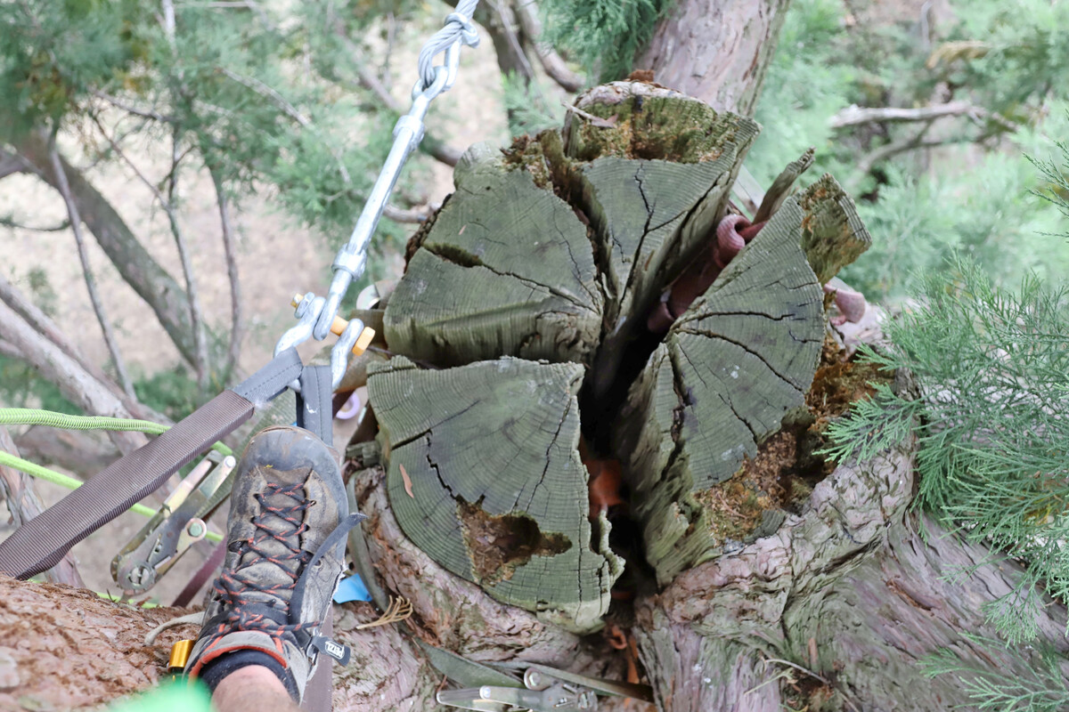 Auch bei dieser Walnuss zeigten sich Fruchtkörper des Zottigen Schillerporlings (Inonotus hispidus), am Kronenansatz und in der Krone. Eine mechanische Vorschädigung am Stammfuß und unteren Stamm sowie eine in der Vitalität deutlich eingeschränkte Oberkrone rundeten zudem die Indikation zur Fällung des Baumes ab. Den Kunden war massiv am Erhalt ihres Baumes gelegen.