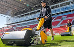 Herr van Vlasselaer, wie sind die Aufgaben in Ihrem Team verteilt? Mein Vater und ich konzentrieren uns vor allem auf das Hauptfeld, Pieter kümmert sich hauptsächlich um die Trainingsfelder. An Spieltagen hilft uns außerdem ein Freiwilliger, das Feld für das Spiel so optimal wie möglich zu gestalten. Was sind die größten Herausforderungen in Ihrer Arbeit? Für die Trainingsfelder ist vor allem die Dauerbelastung ein Problem, es bleibt wenig Zeit zwischen den Trainings, um auf dem Feld zu arbeiten. Das neue, heißere Klima in Kombination mit dem aktuellen Stadionumbau ist eine Herausforderung für das Hauptfeld.