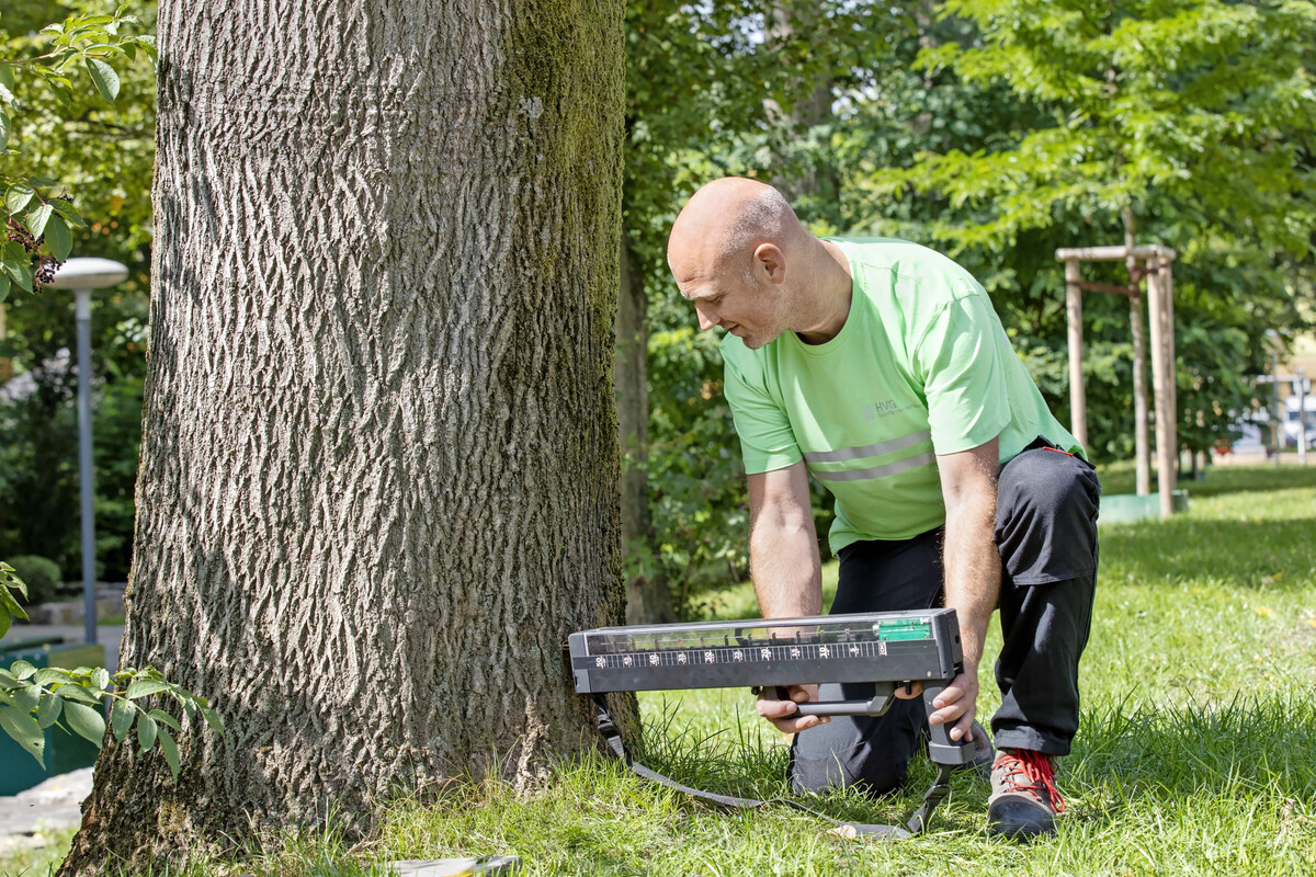 Baumkontrolle und -pflege fallen bei der HVG in das Ressort Baumservice und Verkehrssicherung, das von Matthias Hollender geleitet wird. Nachdem die Nachfrage nach Dienstleistungen rund um Bäume stetig gestiegen war, wurde vor sechs Jahren für den Baumservice ein eigener Fachbereich gegründet, in den auch die Baum- und Spielplatzkontrolle fällt. „Verkehrssicherung ist ein wichtiges Thema, das alle Grundstückseigentümer betrifft. Wir kontrollieren mittlerweile rund eine halbe Million Bäume im ganzen Bundesgebiet und haben uns in diesem Bereich viel Expertise erarbeitet“, sagt Hollender.