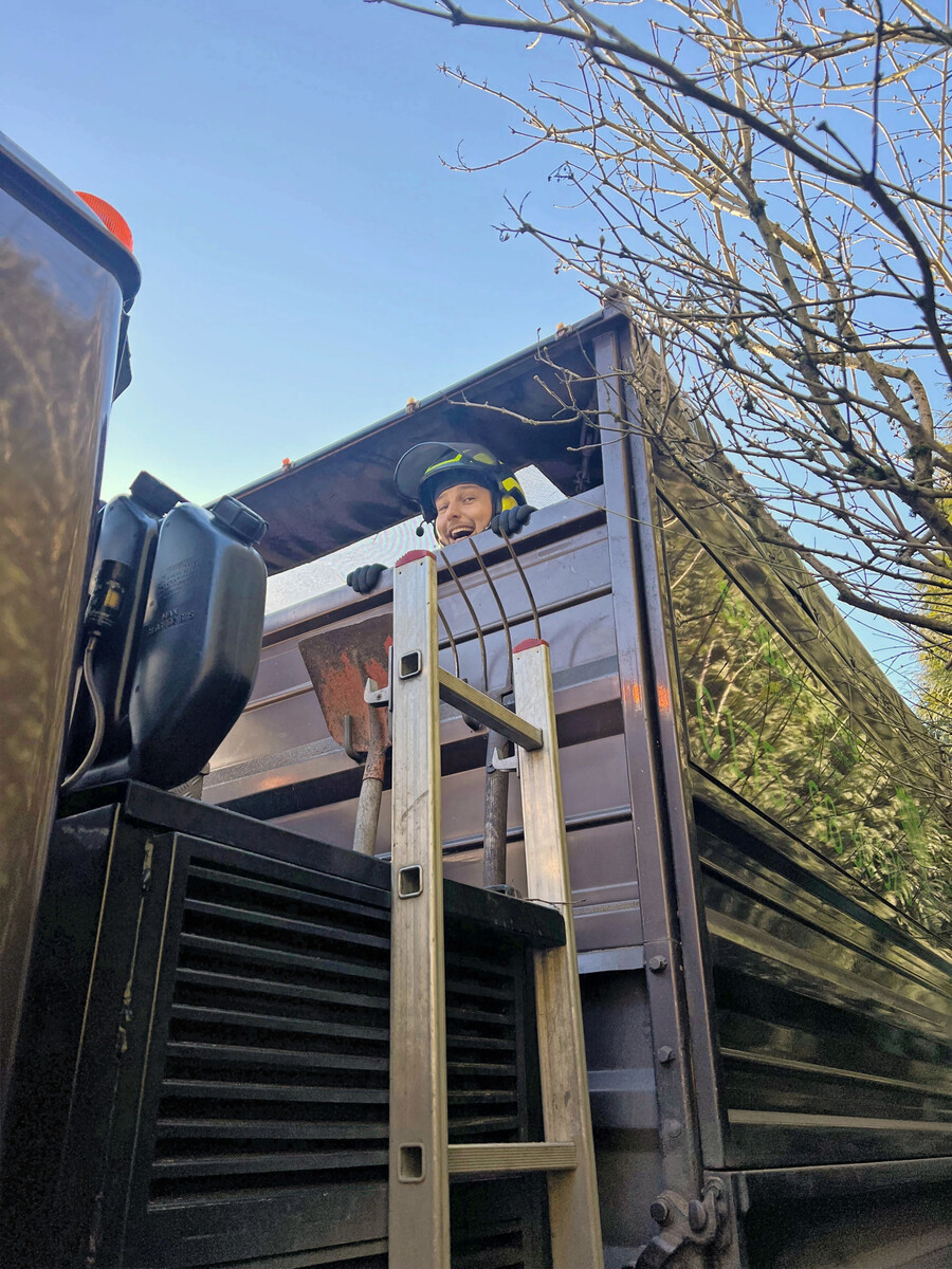 Auch beim Aufräumen setzt SP-Baumpflege auf Technik. Ein Unimog mit Ladekran und Häcksler beschleunigt die Arbeit enorm. „Gerade in der Fällzeit ist Holz oft nass, glitschig und schwer. Was der Kran in den Häcksler schiebt, würden sonst mindestens vier Leute tragen müssen.“ Für Petersen ist klar: Baumpflege ist körperlich fordernd – da ist jede Entlastung willkommen.