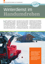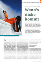 Ab einer Schneehöhe von 20 cm wird es mit der Kehrmaschine schwierig bis unmöglich, die weiße Pracht beiseitezuschaffen. Da kommen die zweistufigen Schneefräsen zum Einsatz. Dabei durchläuft der Schnee zwei Förderstufen. Zuerst wird der Schnee mit der ersten waagerechten Schnecke aufgenommen und zur Fräshaubenmitte transportiert. Dort wird er dann von einer zweiten Schnecke aufgenommen und beschleunigt, damit er weit aus dem Schacht geschleudert werden kann. Bei Pulverschnee auf glatter Fläche ist das alles bis 50 cm Schneehöhe kein Problem. Aber wehe, wenn der Schnee schwer wird, verfestigt ist, die Temperatur weit unter -10 °C sinkt oder der Untergrund mit steinigen Hindernissen versehen ist. Dann schlägt die Stunde der Wahrheit.