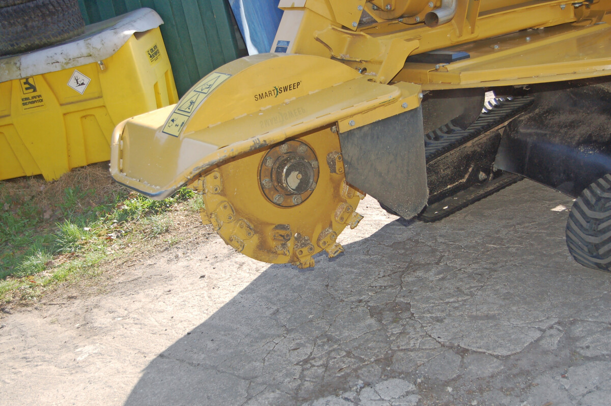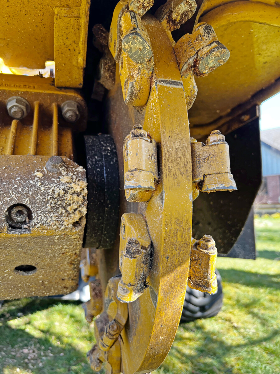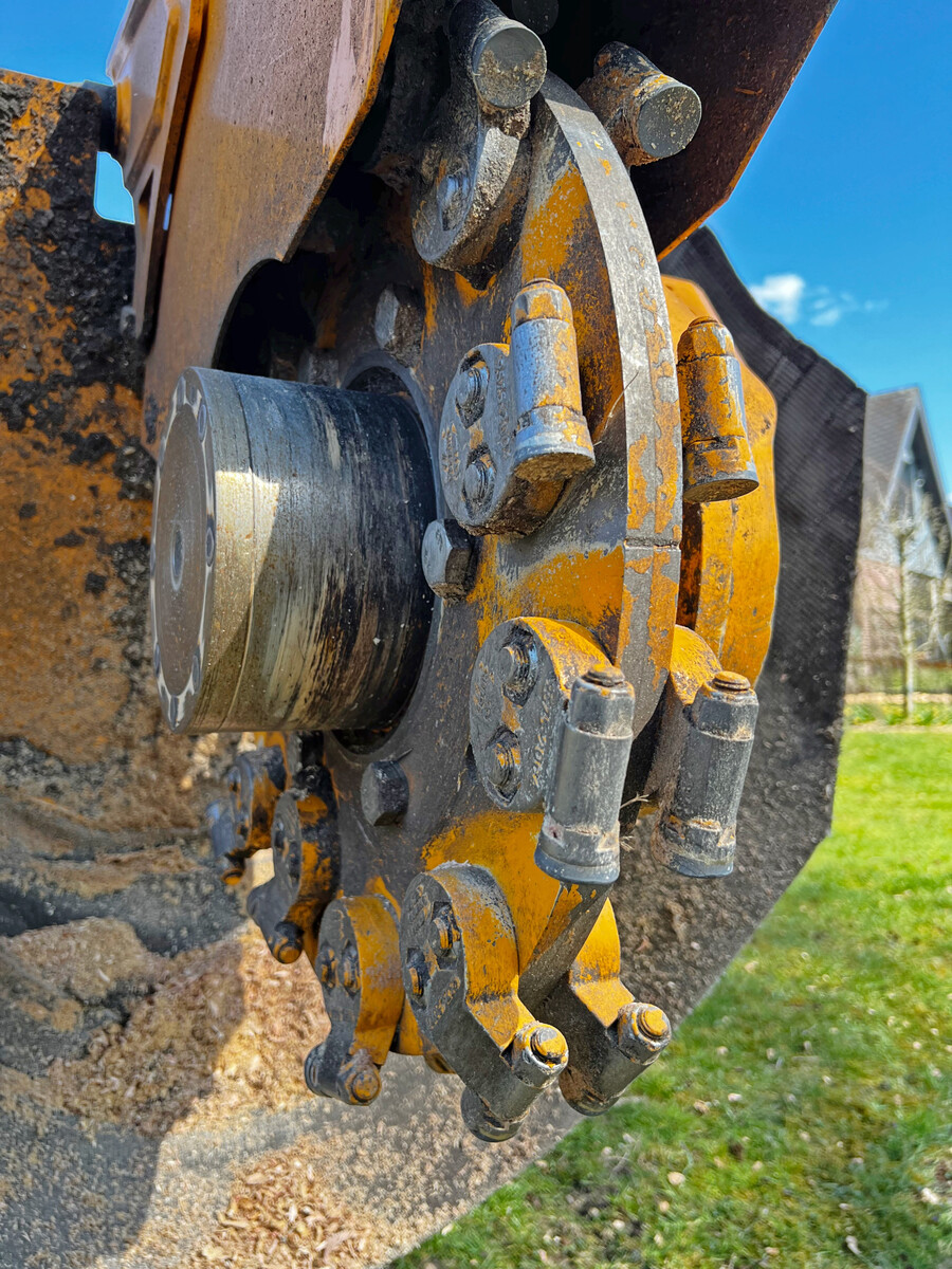 Der Fräsarm sitzt auf einem Drehzapfen vor dem Motor und schwenkt mithilfe von zwei Zylindern über dem Stock. Die Armkinematik sorgt dafür, dass sich die Fräshöhe mit 630 mm sehen lassen kann. Das Fräsrad trägt 24?Rundmeißel-Werkzeuge mit Wolframkarbid-Spitzen, die man dreimal drehen kann, um ihre Standzeit zu verlängern. Dabei gibt es zwei unterschiedliche Zahnträger.