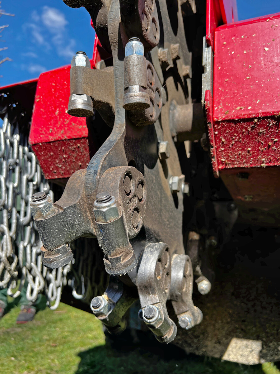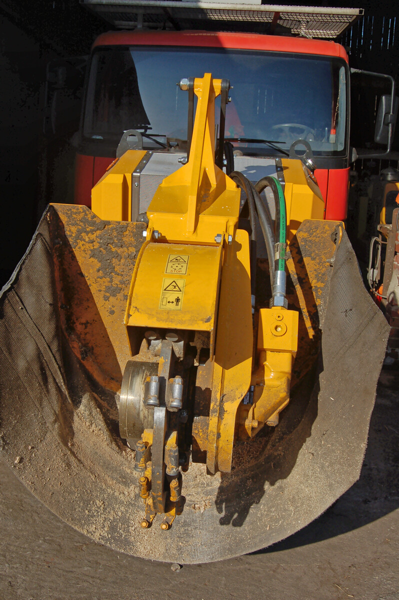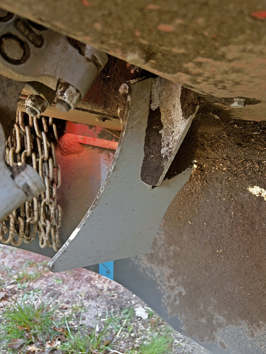 Das Fräsrad wird beidseitig über Dreifachkeilriemen mit Kraft versorgt. Alle 50 bis 100 h ist Nachspannen angesagt, aber sie halten sehr gut und sind quasi servicefrei. Gut gefallen hat der lange Fräsarm, mit dem man tief und sehr hoch fräsen kann. Dazu trägt auch das Heckschild bei, mit dem sich das Heck ein Stück weit anheben lässt. Es dient aber vor allem dazu, um das Fräsmaterial nach der Arbeit zu verteilen. Während der Fräsarbeit hilft dabei auch das neu eingeführte Leitblech „Chip Raffle“ unter dem Oberwagen, das die Späne beim Fräsen zur Seite schiebt.