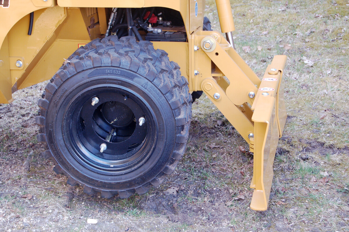 Unser Testgerät FSI D74 besitzt ein allradgetriebenes Vierradfahrwerk, das für den Arbeitseinsatz an der Vorderachse serienmäßig mit Zwillingsreifen bestückt ist. Um 89?cm Durchfahrtbreite zu erreichen, muss man sie zwar demontieren, der Aufwand ist bei zwei Rädern aber nicht groß. Wem das nicht gefällt, kann die Maschine auch mit Raupenfahrwerk erhalten. Mit 3,27?m Länge bleibt die Maschine zugleich wendig.