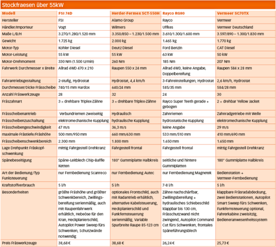 Wie bei Rayco kommen auch die Stockfräsen von Vermeer aus den USA. Das Unternehmen baut unter anderem Stockfräsen, Grabenfräsen, Horizontalzerkleinerer und Schredder, dazu kommen Kompaktlader und Holzhäcksler. Das Programm der Wurzelstockfräsen umfasst sieben Modelle zwischen 19 und 50?kW Motorleistung sowie mit Rad- und Raupenlaufwerken. Unser Testmodell SC70TX ist mit seinem 50-kW-Diesel von Caterpillar (260?Nm Drehmoment) die am stärksten motorisierte Stockfräse dieses Herstellers.