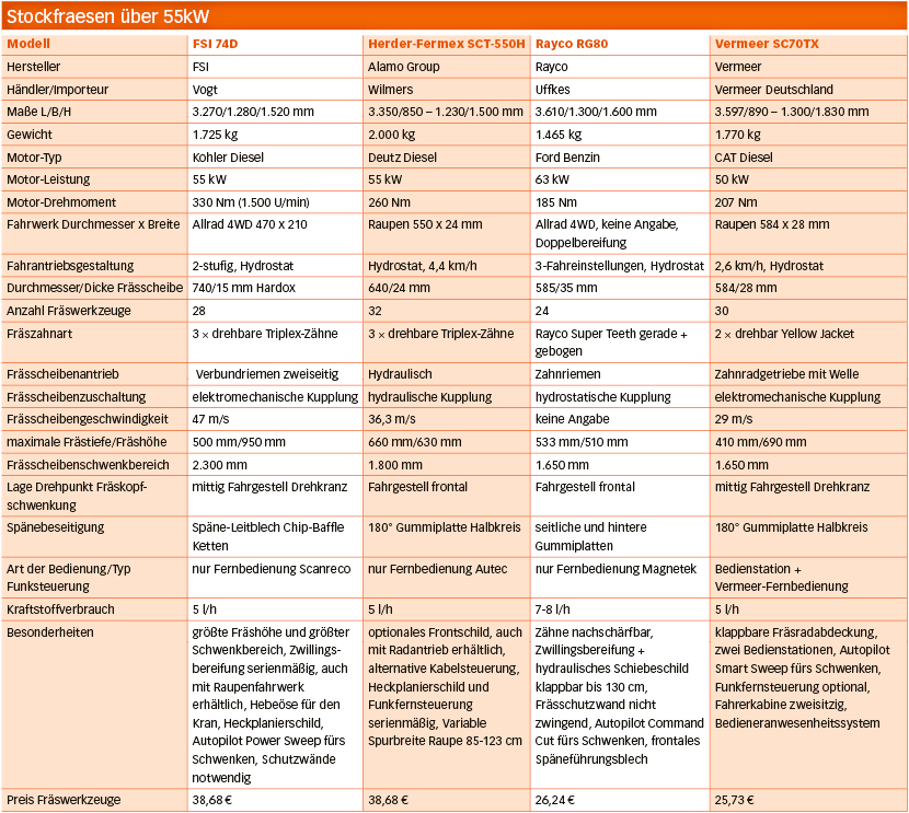 Mit den Wurzelanläufen alter Bäume kommen schon mal Fräsdurchmesser von 4 bis 5 m und Fräshöhen von über 100 cm vor, die bewältigt werden müssen. Begrenzende Faktoren wie Mauern und Zäune sind nicht selten, deshalb müssen diese großen Geschütze auch gut beweglich sein. Die dafür notwendige Stubben- oder Stockfrästechnik benötigt deshalb eine Motorleistung von mindestens 50 kW, einen effektiven Fahrantrieb, entweder über Raupenketten oder Ackerstollenreifen, ein massives großes Fräsrad (über 55 cm) sowie einen möglichst großen horizontalen (über 150 cm) und vertikalen (über 100 cm) Schwenkbereich.